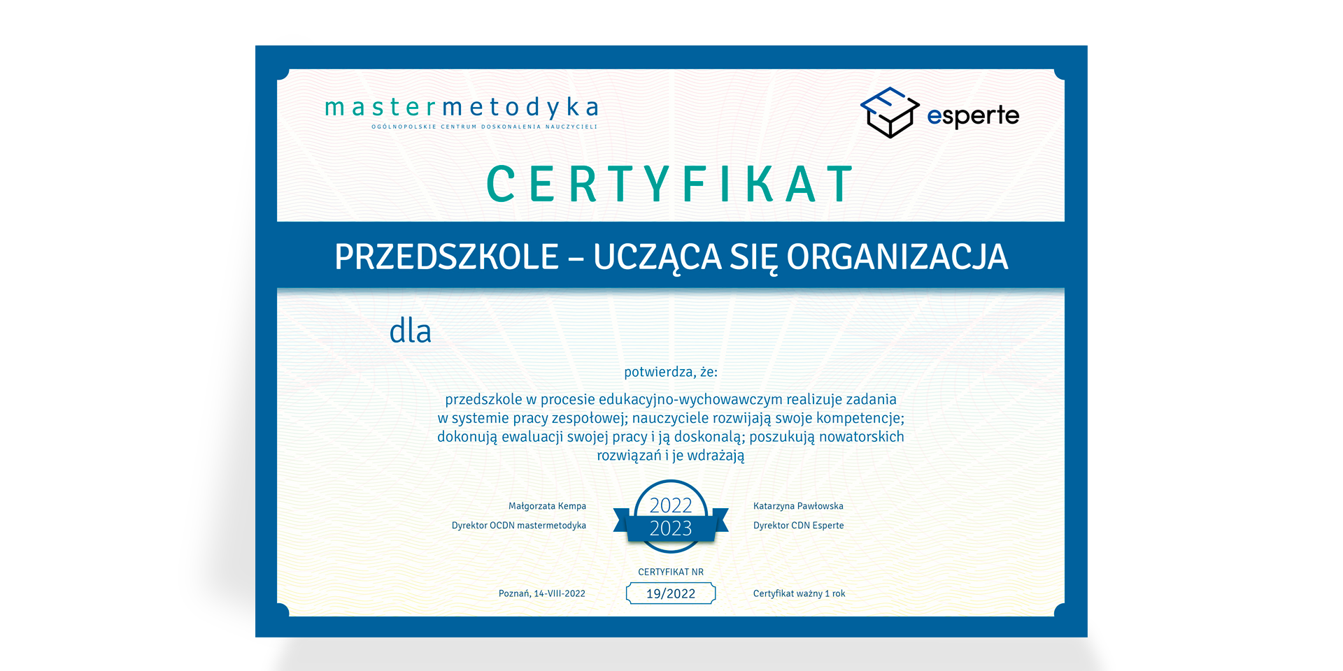 Udział w programie wsparcia kończy uzyskanie certyfikatu jakości „Przedszkole - ucząca się organizacja”.